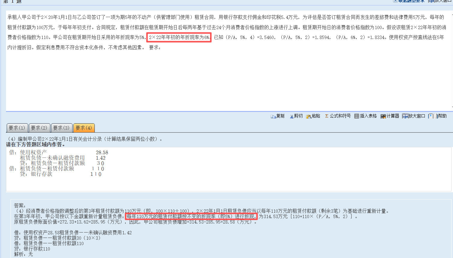 老师,请问题干说“2×22年年初的年折现率为6%”,为什么第4问答案“每年110万元的租赁付款额按不变的折现率(即5%)进行折现”?